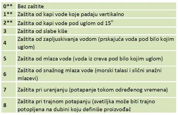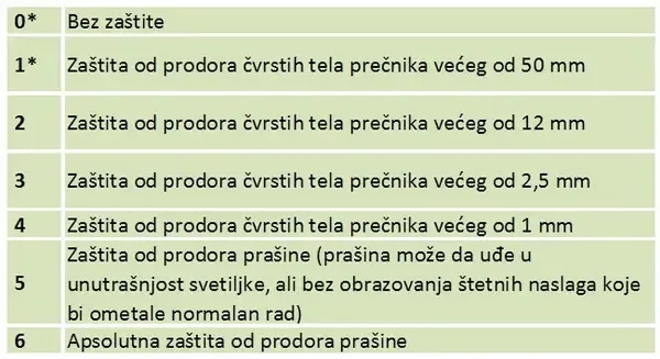 IP protection (short for Ingress Protection) of luminaires represents the level of protection against the ingress of solid objects and liquids and is precisely defined by the international standard EN60598. The designation consists of the IP marking and two numbers (e.g. IP20; IP44; IP65…) where the first number can have a value from 0 to 6 and represents the degree of protection against the ingress of foreign solid objects, while the second number can have a value from 0 to 8 and represents the degree of protection against the ingress of liquids.