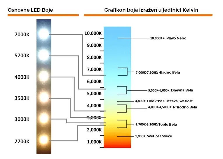 Light color temperature represents the color of light from a lamp or light source and is expressed in Kelvins. We define light color temperature by heating an absolute black body (a concept in physics known as a body without reflection properties) to a certain temperature, and this heated body at certain temperatures takes on a very specific color so that at lower temperatures the heated body is dark red in color and as the temperature increases it fades and takes on more and more blue elements in the spectrum. The image below shows the spectrum of light colors ranging from pale red to pale blue.