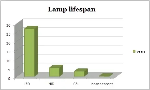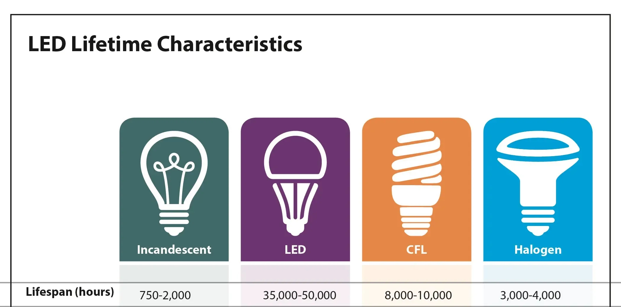 LED lighting manufacturers have a legal obligation to declare the expected operating life of the bulb. Depending on the manufacturer's quality, the expected lifespan of LED bulbs ranges from 15,000 up to 50,000 operating hours. If we compare this with the expected operating life of a classic, incandescent bulb, which is between 750 - 1500 operating hours, it is clear that the difference is enormous.
