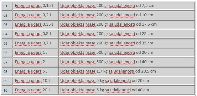 The marking of the degree of mechanical impact resistance is IK followed by a value that can be in the range from 01 to 10. The table below provides a more detailed explanation of mechanical impact resistance depending on the IK protection value:
