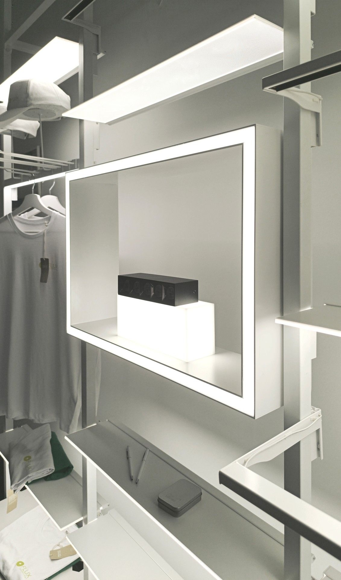 SKYLINE illuminated shelves and light base holders, as basic elements of furniture and lighting, can be moved to different positions vertically at the request of the user (they are not fixed), without additional el. cabling or moving existing elements.