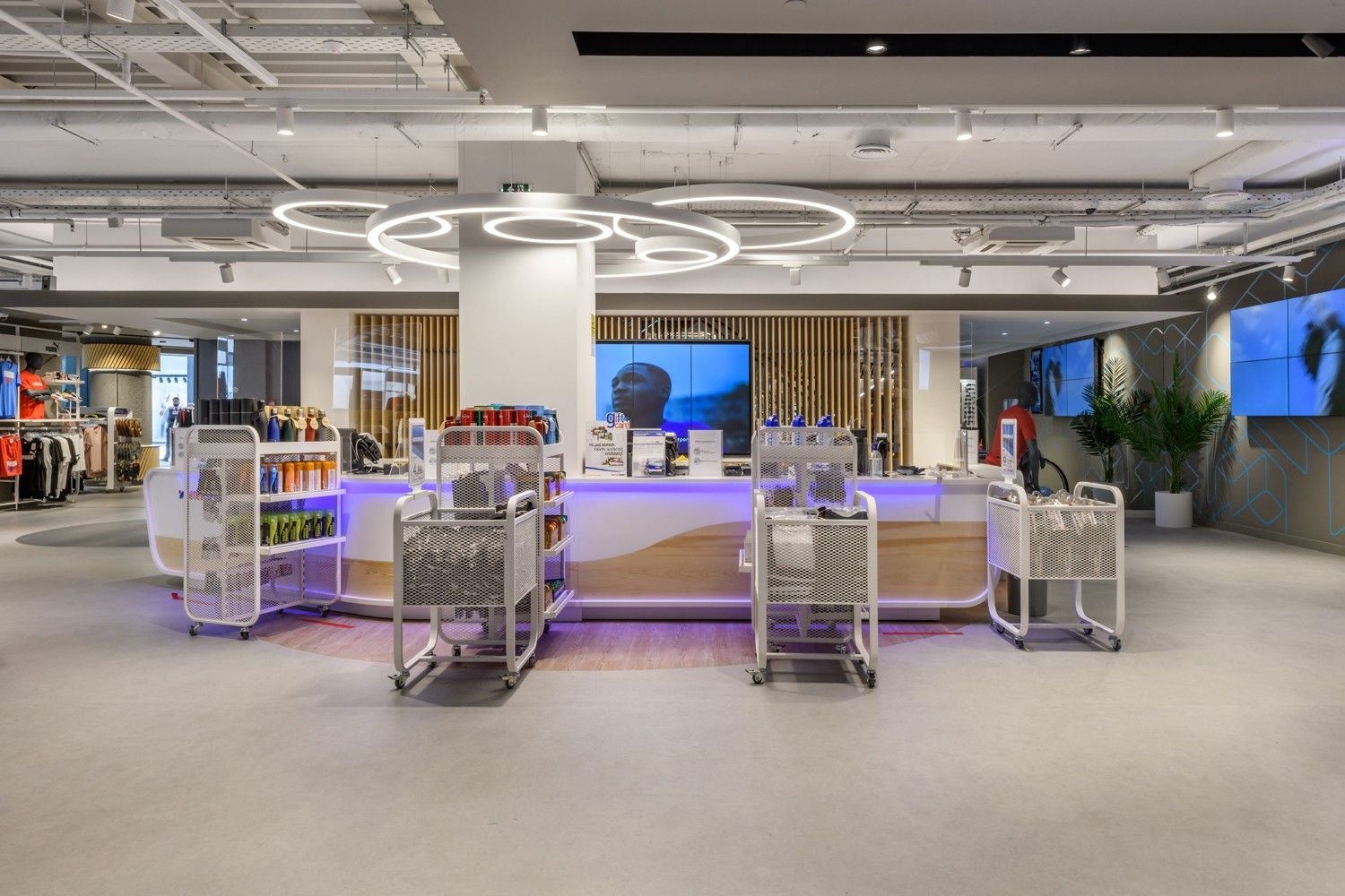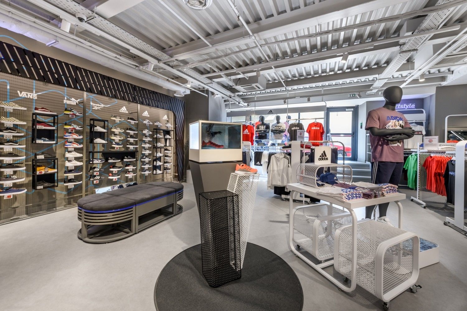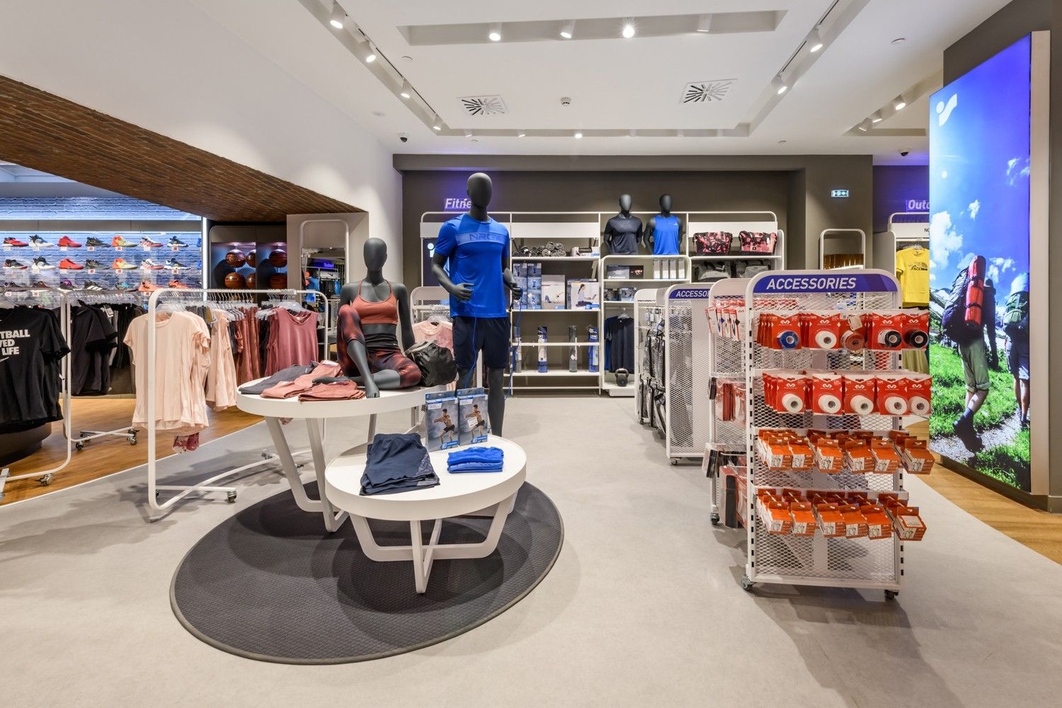 Intersport is one of our long-standing partners. Their lighting concept is based on track systems and track spotlights, complemented by decorative elements such as light rings, which give the space an elegant and sophisticated appearance. To further meet their needs, we have also developed specially designed furniture, tailored for optimal product presentation and seamless integration of lighting elements. This approach ensures functional yet visually appealing store lighting, highlighting products while creating a pleasant shopping atmosphere.