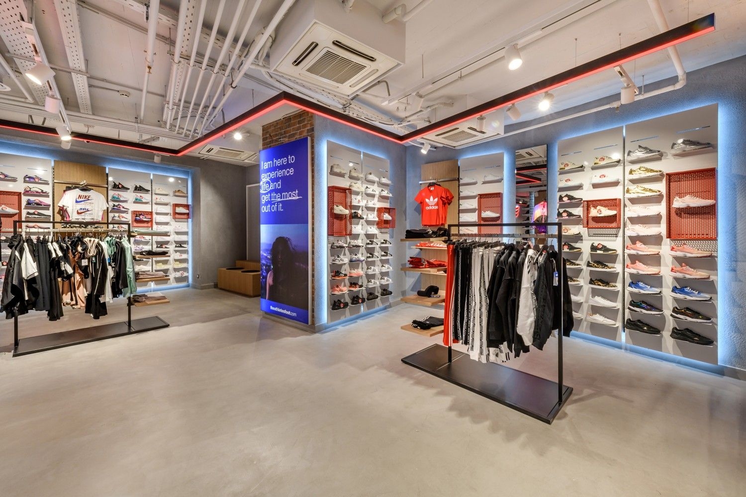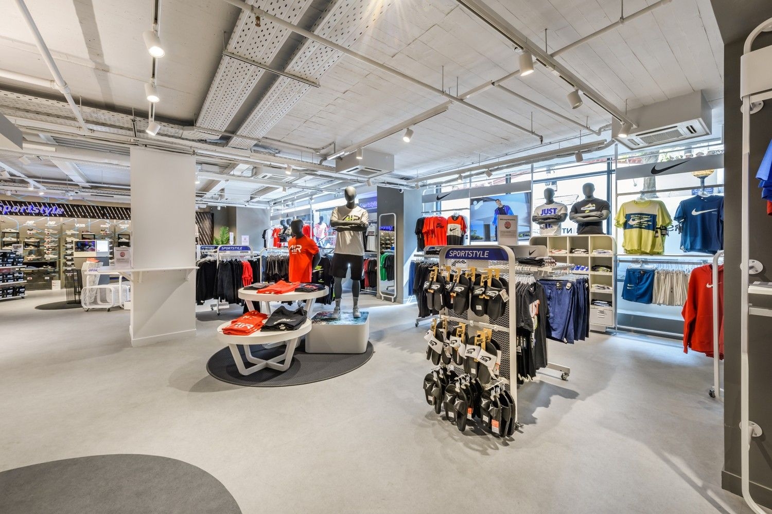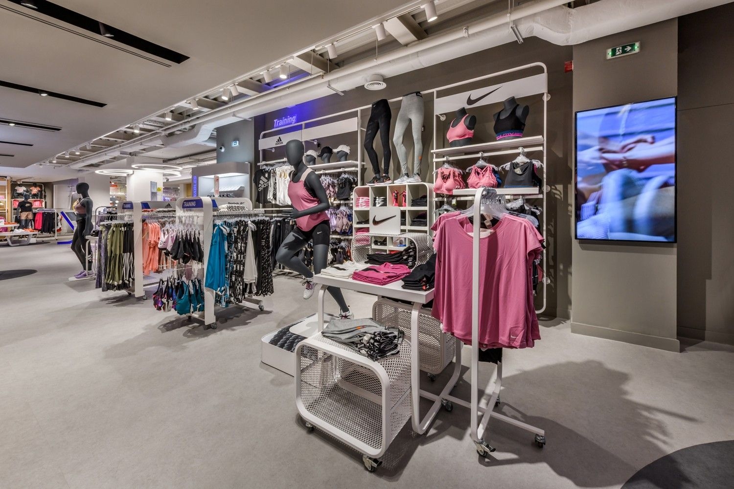 Intersport is one of our long-standing partners. Their lighting concept is based on track systems and track spotlights, complemented by decorative elements such as light rings, which give the space an elegant and sophisticated appearance. To further meet their needs, we have also developed specially designed furniture, tailored for optimal product presentation and seamless integration of lighting elements. This approach ensures functional yet visually appealing store lighting, highlighting products while creating a pleasant shopping atmosphere.